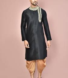 Black dupion art silk kurta with computerised embroidery machine work churidar