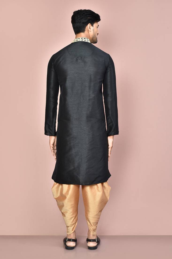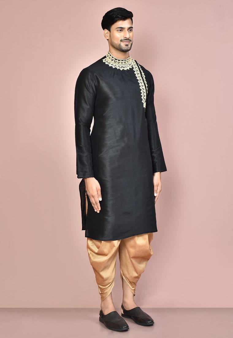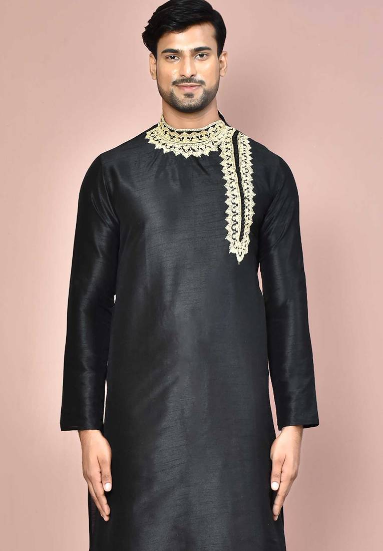 | Product Description | Black Dupion Art Silk Kurta With Computerised Embroidery Machine Work Churidar |