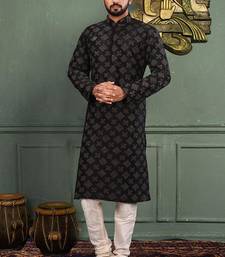 Black dupion art silk kurta with computerised embroidery machine work churidar