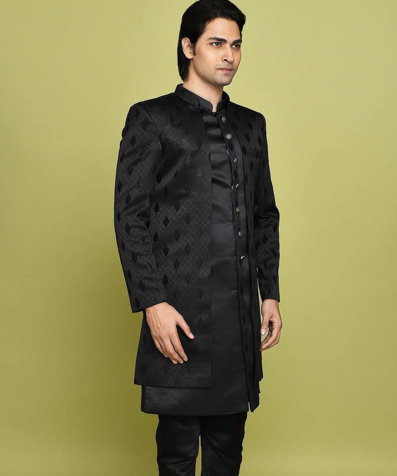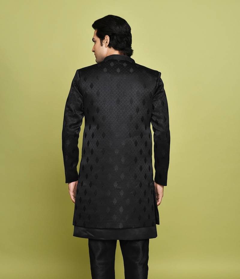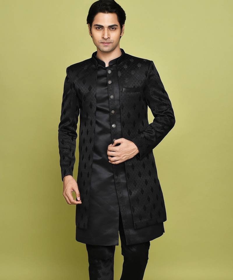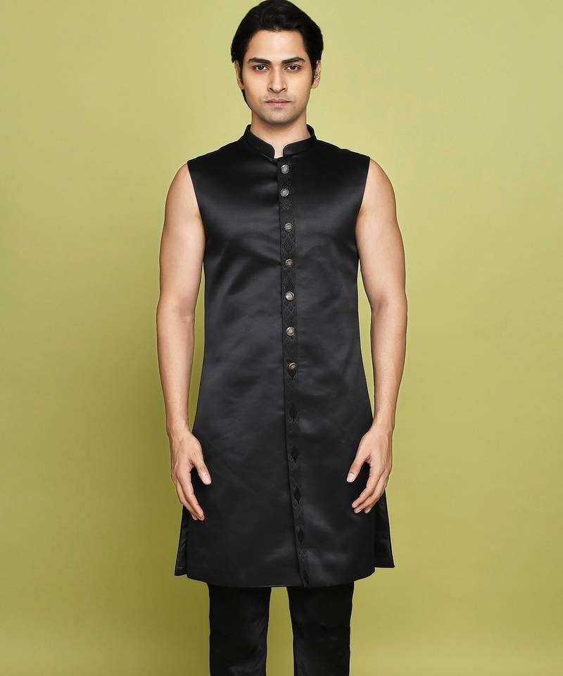 | Product Name | Black Front Open Pattern Design With Detached Inside Sleeveless Jacket Indo Western | |