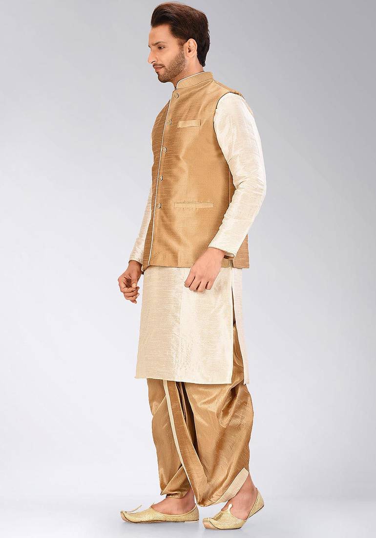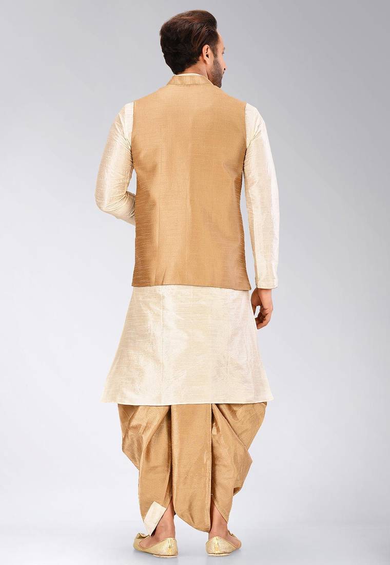 Deep cream dupon art silk kurta, jacket with matching dhoti