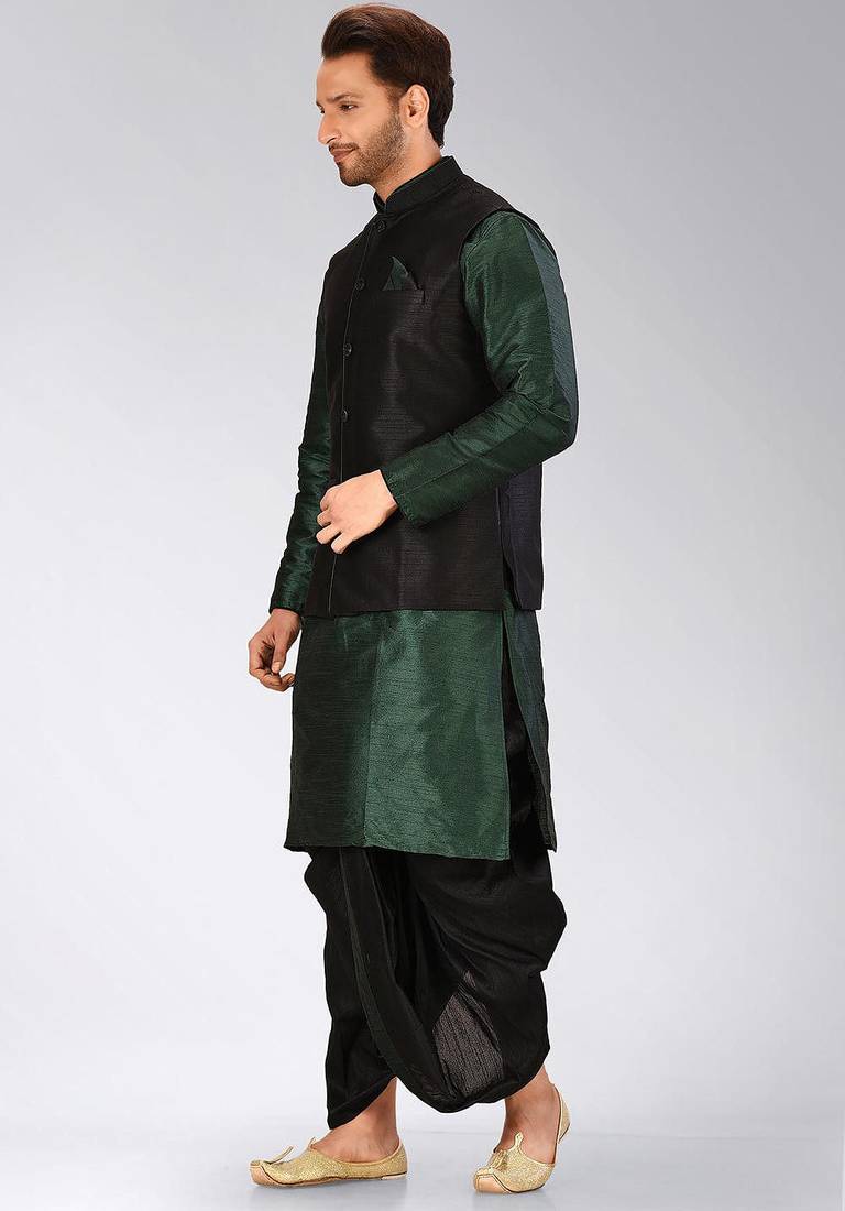 Rama green dupon art silk kurta, jacket with matching dhoti