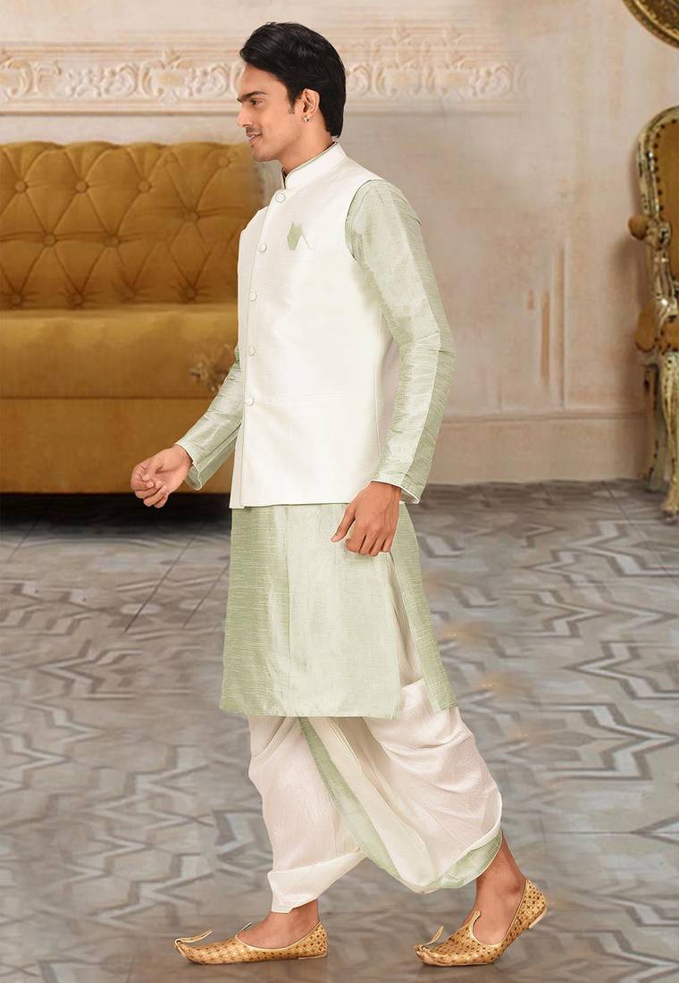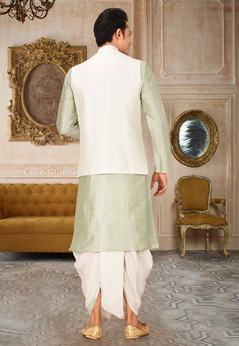Sea green dupon art silk kurta, jacket with matching dhoti