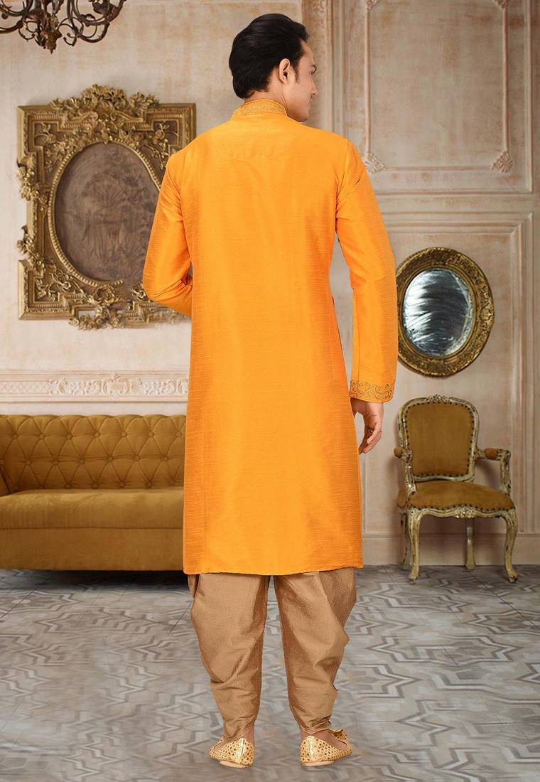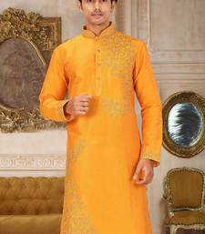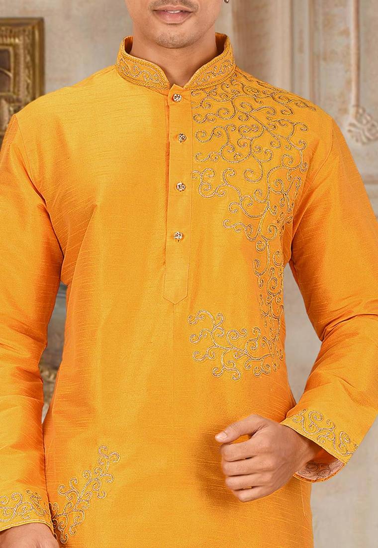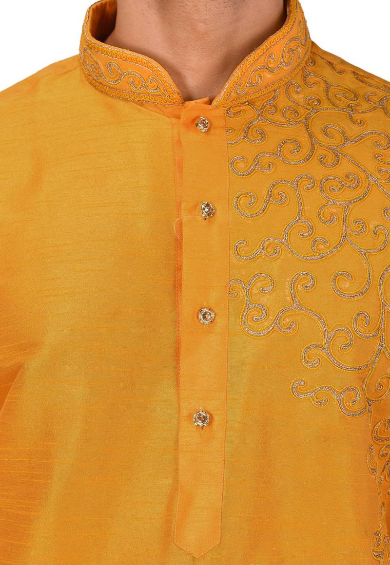 | Product Description | Yellow Dupion Art Silk Kurta With Computerised Embroidery Machine Work Churidar |