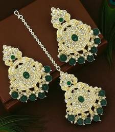 Add A Regal Charm To Your Festive Look With The Gold Plated Cubic Zircon Studded Green Earrings With Maangtikka Set. Designed With Sparkling Cz Stones And Rich Green Accents, This Jewellery Set Is Perfect To Pair With Lehengas, Sarees, And Anarkalis. The Matching Maangtikka Enhances The Elegance, Making It A Must Have For Weddings, Parties, And Cultural Celebrations