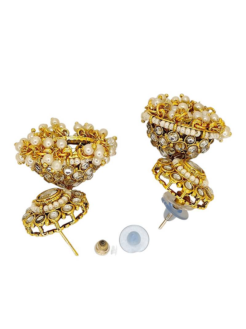 Gold Toned Choker Set, Studded With Kundan, Cubic Zircon, Beads. Secured With Drawstring Closure. A Pair Of Matching Jhumka Earrings, Secured With Post And Back Closure. A Matching Maang Tikka. Secured With S Hook Closure