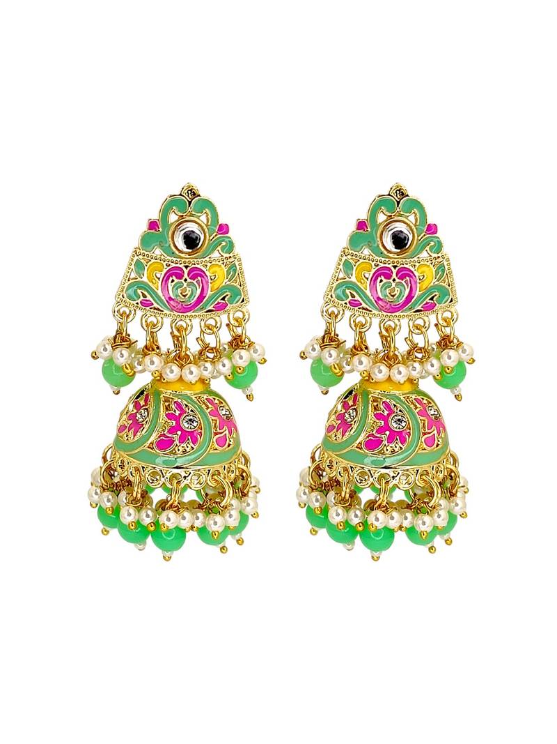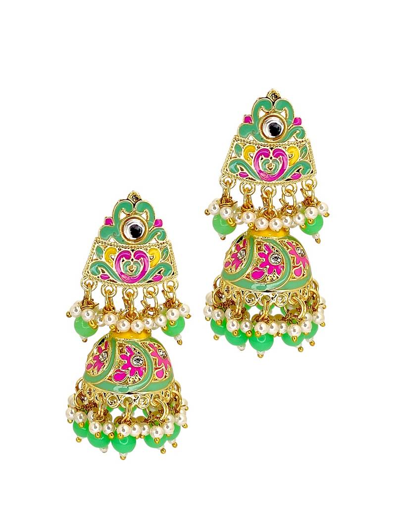 | Product Description | Gold Toned Meenakari Mint Green Rajputi Jhumka Earrings, Studded With Kundan, Cubic Zircon And Beads. Secured With Post And Back Closure