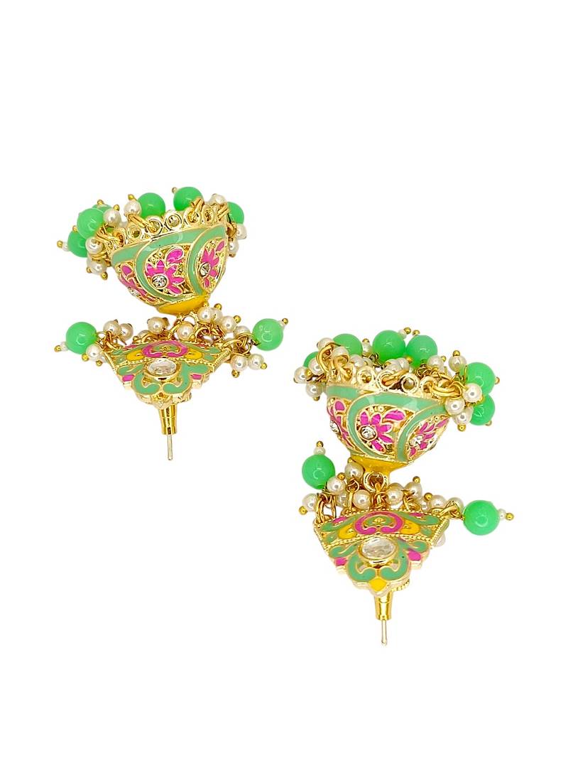 | Product Name | Gold Plated Kundan Meenakari Lime Green Jhumka Earrings | |