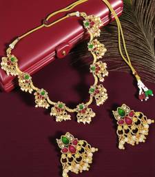| Product Description | Gold Toned Lotus Motif South Indian Necklace Set. Studded With Cubic Zircon, Green, Red Stone And Beads. Secured With Drawstring Closure. A Pair Of Matching Dangler Earrings, Each Secured With Post And Back Closure |