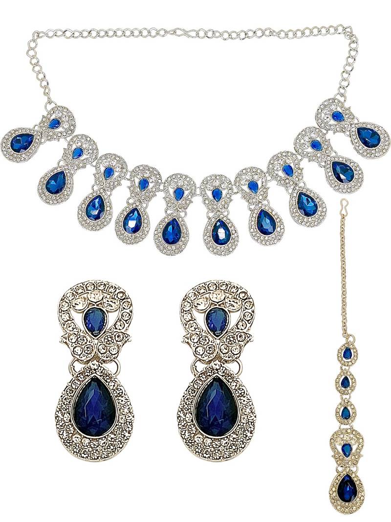 Rhodium plated blue teardrop cubic zircon necklace maang tikka set