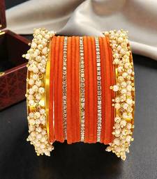| Product Description | Set Of 17 Chuda Set With Set Of 2 Gold Toned Beaded Kada Bangle Set, Each Secured With Slip On Closure. Set Of 3 Gold Toned Cubic Zircon Studded Thin Bangles, Each Secured With Slip On Closure. Set Of 12 Orange Velvet Bangle Set, Each Secured With Slip On Closure.