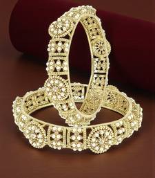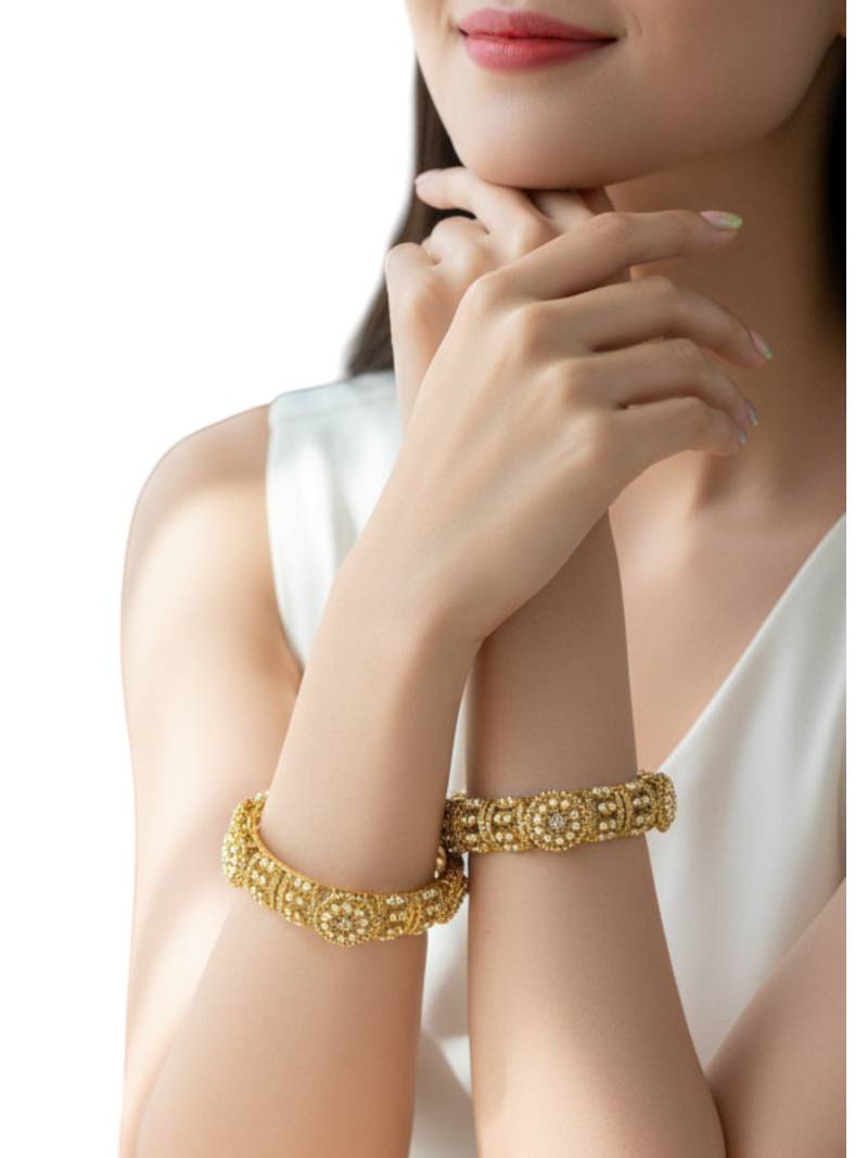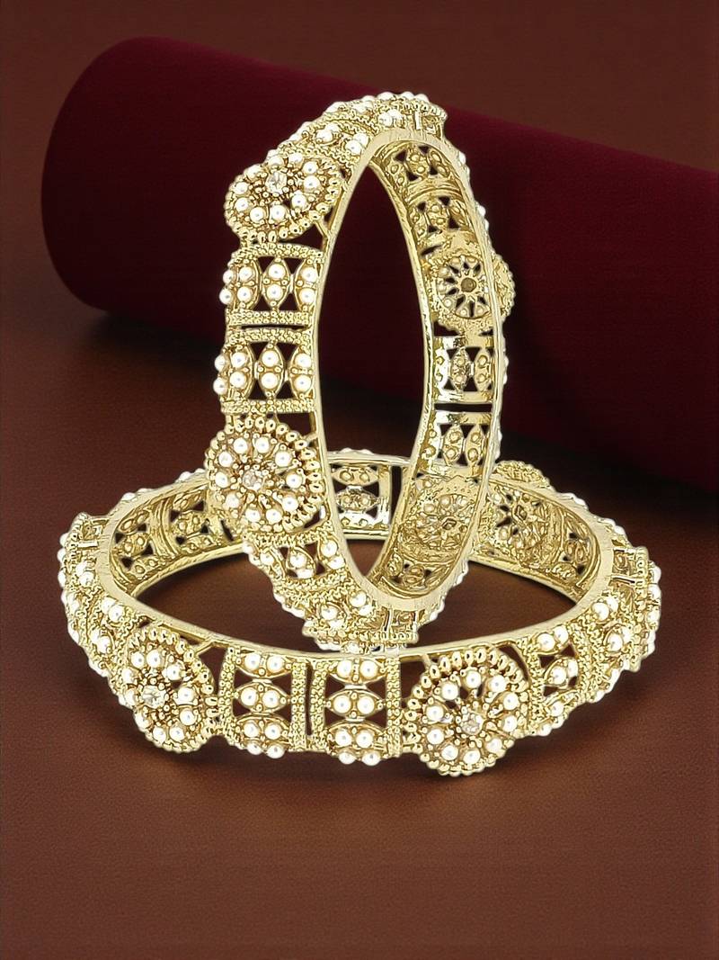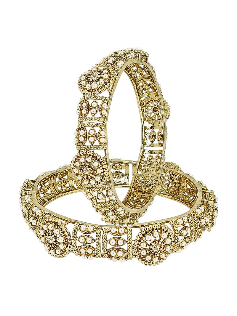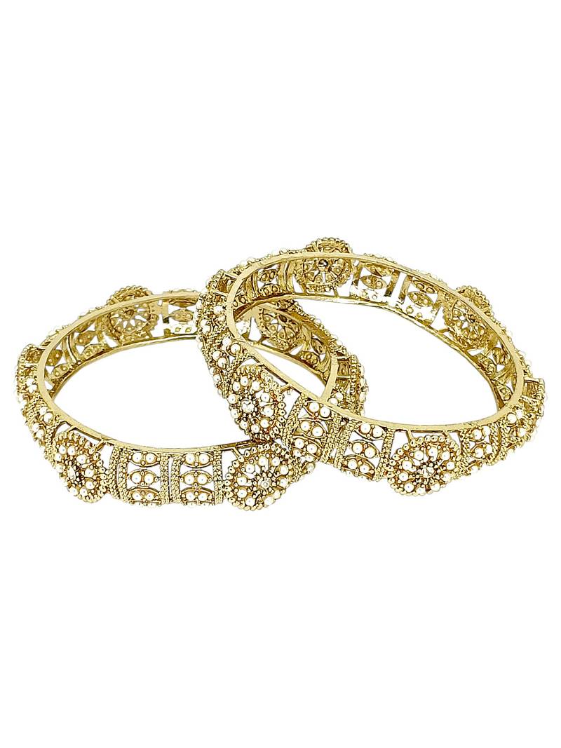 | Product Description | Set Of 2 Antique Gold Plated Intricate Filigree Work Bangle Set Studded With White Beads. Secured With Slip On Closure.