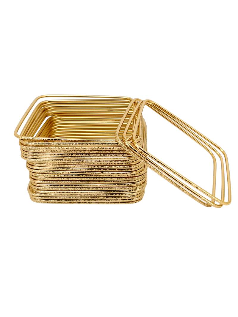 | Product Description | Set Of 24 Gold Toned Square Shape Shimmer Bangles. Secured With Slip On Closure.