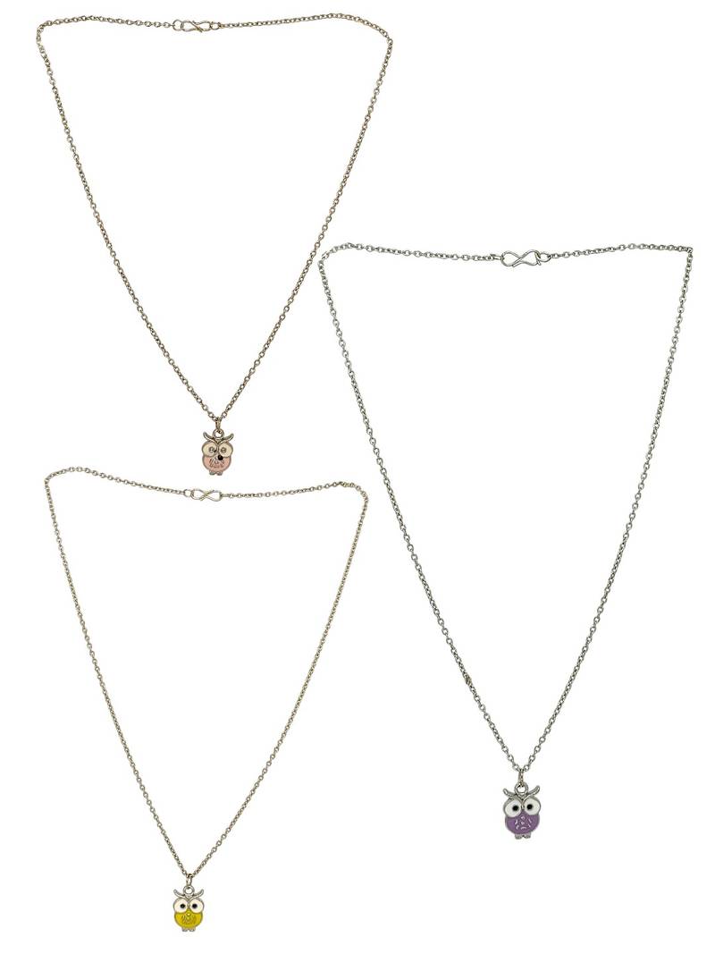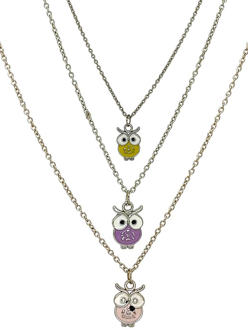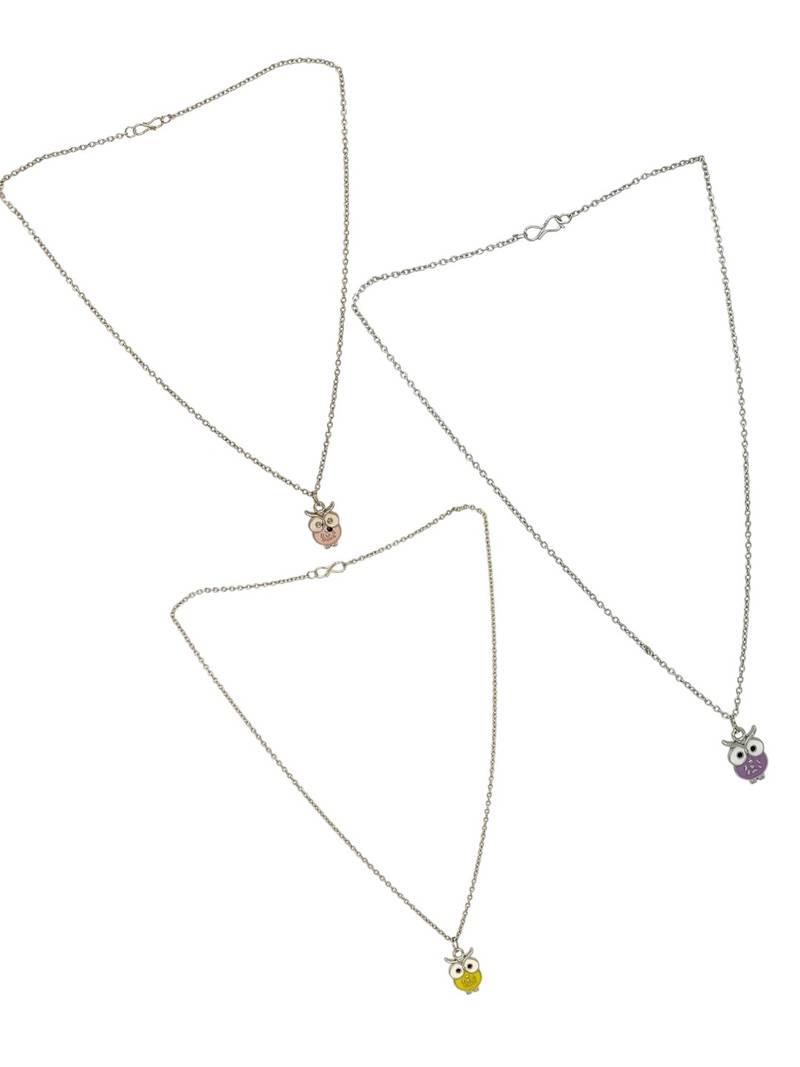 | Product Description | This Set Of Three Silver Toned Necklaces Features Delightful Owl Pendants In Yellow, Purple, And Pink Colors, Adding A Cheerful And Playful Touch To Any Outfit. Each Pendant Hangs From A Matching Chain And Is Secured With A Simple S Hook Closure, Making The Set Both Stylish And Easy To Wear. Chain Length: 22cm, Width: 0.2cm, Pendant Length: 1.8cm, Width: 1.2cm |
