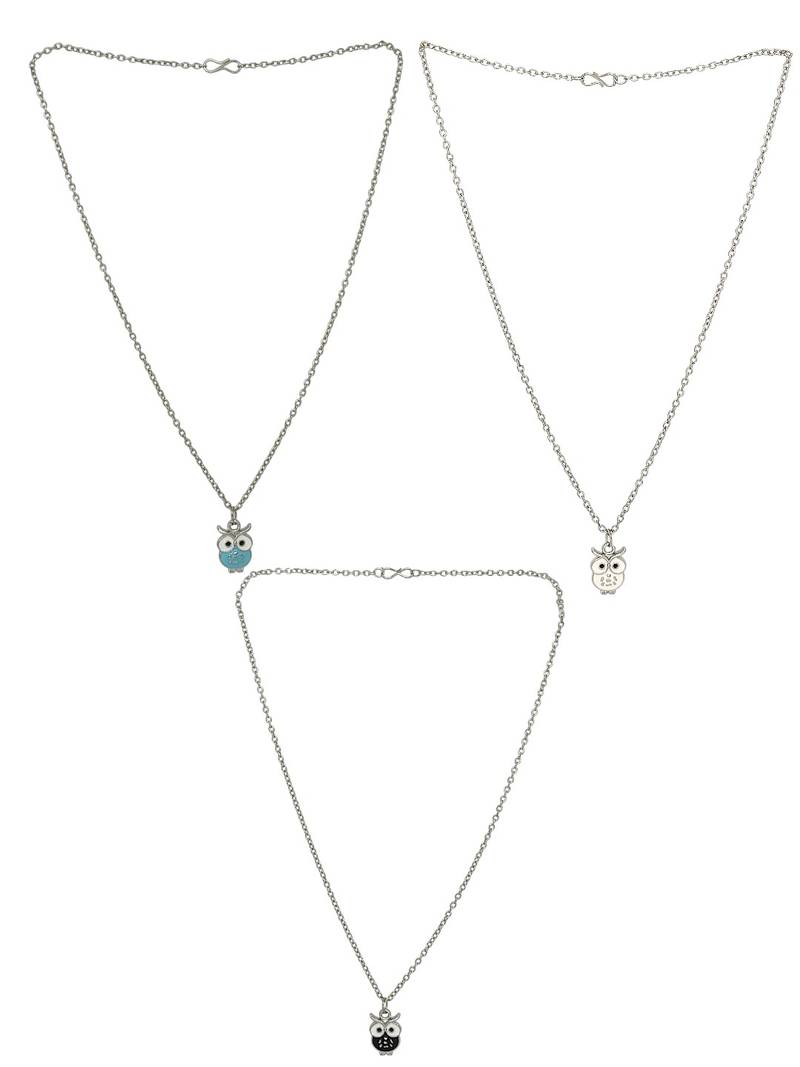 | Product Description | This Set Of Three Silver Toned Necklaces Features Cute Owl Pendants In Black, White, And Sky Blue Colors, Offering A Fun And Versatile Selection To Complement Different Looks. Each Pendant Hangs From A Matching Chain And Is Secured With An Easy To Use S Hook Closure, Making The Set Both Stylish And Convenient For Everyday Wear. Chain Length: 22cm, Width: 0.2cm, Pendant Length: 1.8cm, Width: 1.2cm |