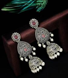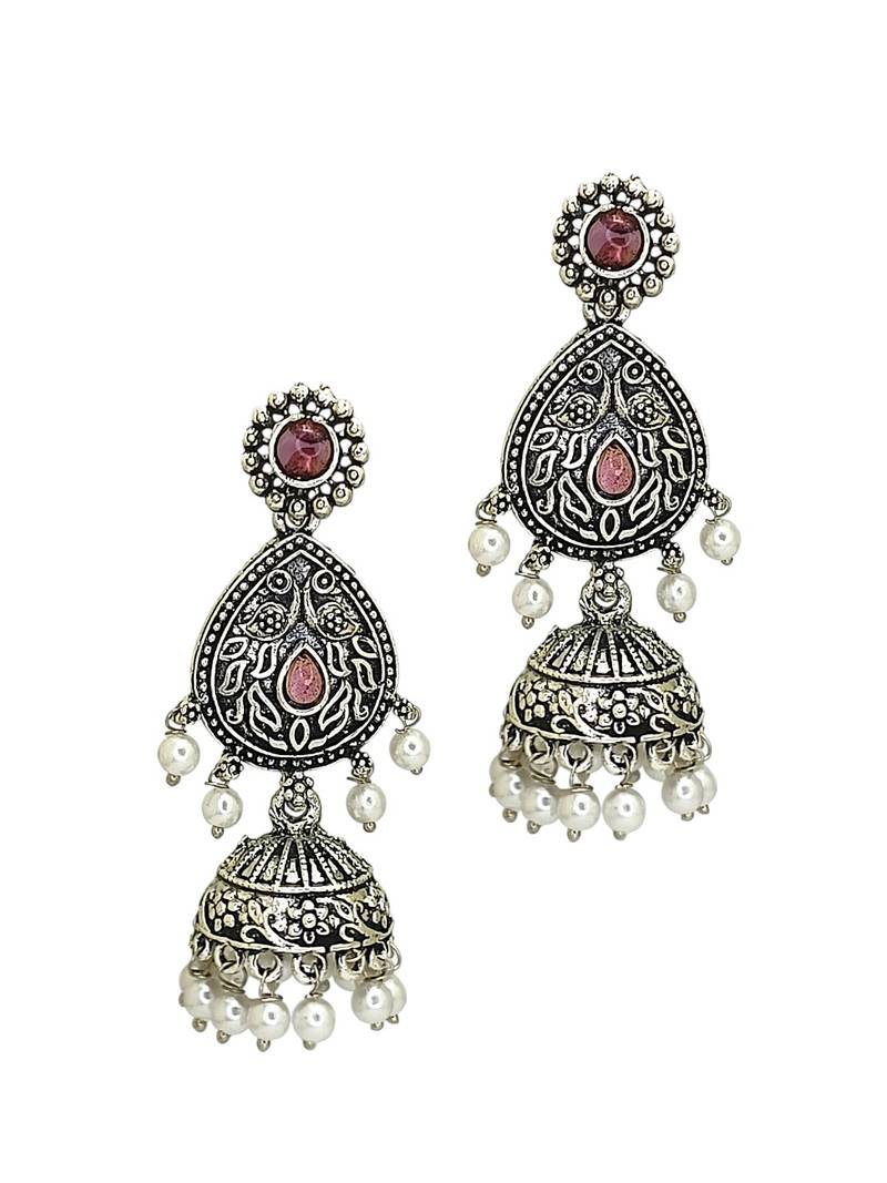 Silver Oxidised Drop Jhumka Studded Pink Stones And White Beads. Secured With Post And Back Closure