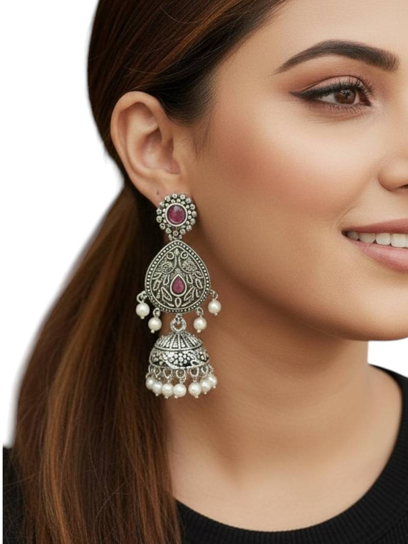 • Vibrant Pink Stone Embellishments: Each Earring Is Studded With Sparkling Pink Stones That Create A Striking Contrast Against The Oxidised Silver Base. The Stones Add A Touch Of Brightness And Elegance, Elevating The Overall Visual Appeal.