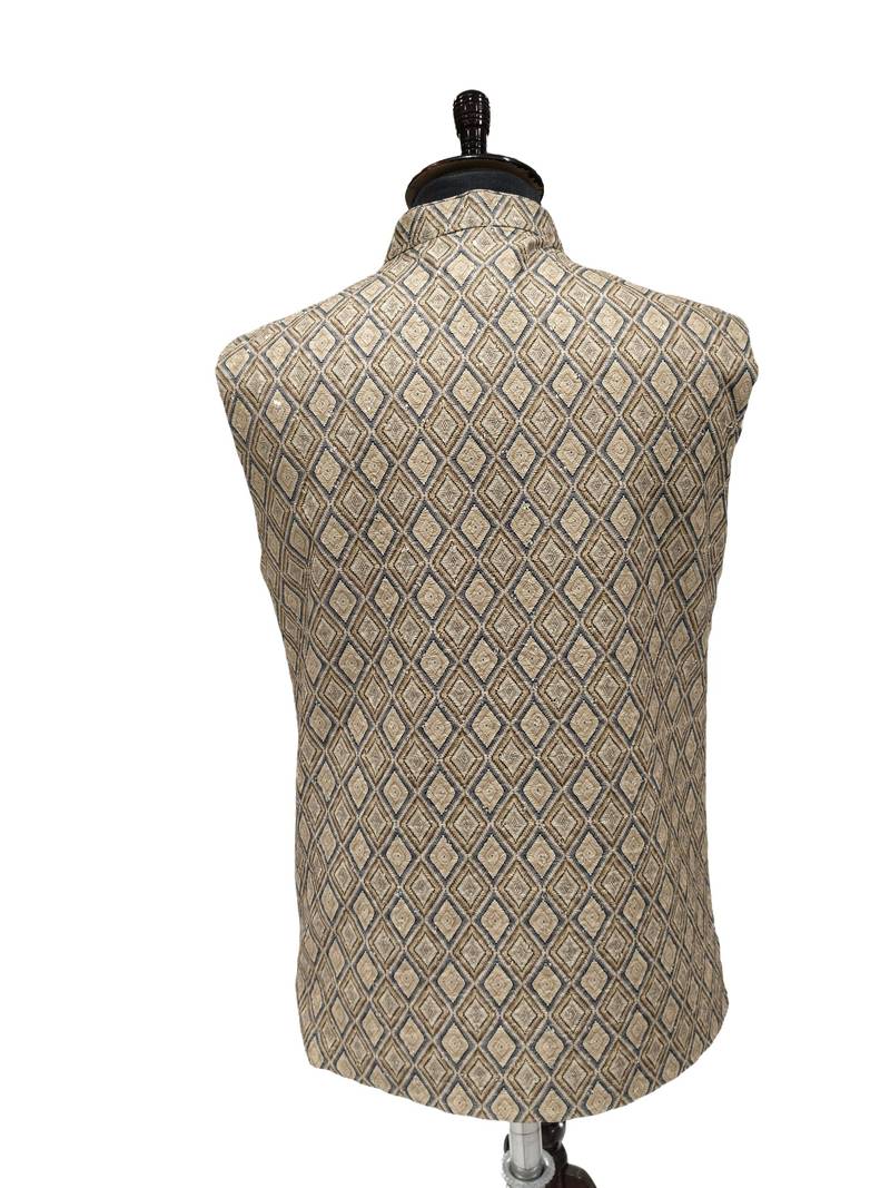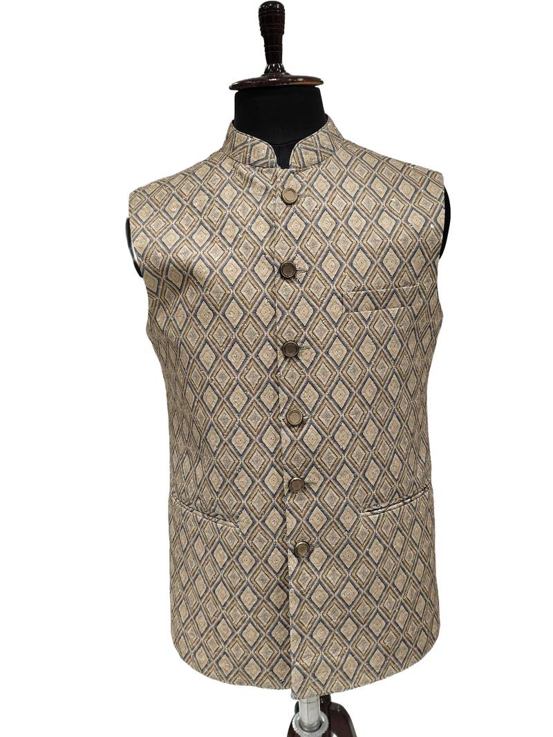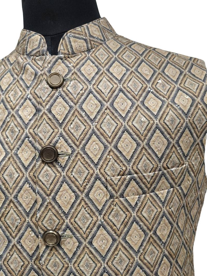 | Product Description | This Item Is A Men's Ethnic Nehru Jacket Featuring A Sleeveless Design And Crafted With A Geometric Pattern. The Fabric Showcases Intricate Diamond Motifs In Beige, Gold, And Grey Tones, Enhanced With Subtle Sequins For A Touch Of Shimmer. The Jacket Is Tailored With A Bandhgala (Nehru) Collar, A Front Button Placket Using Metallic Toned Buttons, And Three Pockets—One Chest Pocket And Two Lower Front Pockets—For Convenience And Style. The Material Appears To Be A Blend Suitable For Festive, Wedding, Or Formal Traditional Occasions, Offering A Rich Texture And Sophisticated Appeal.