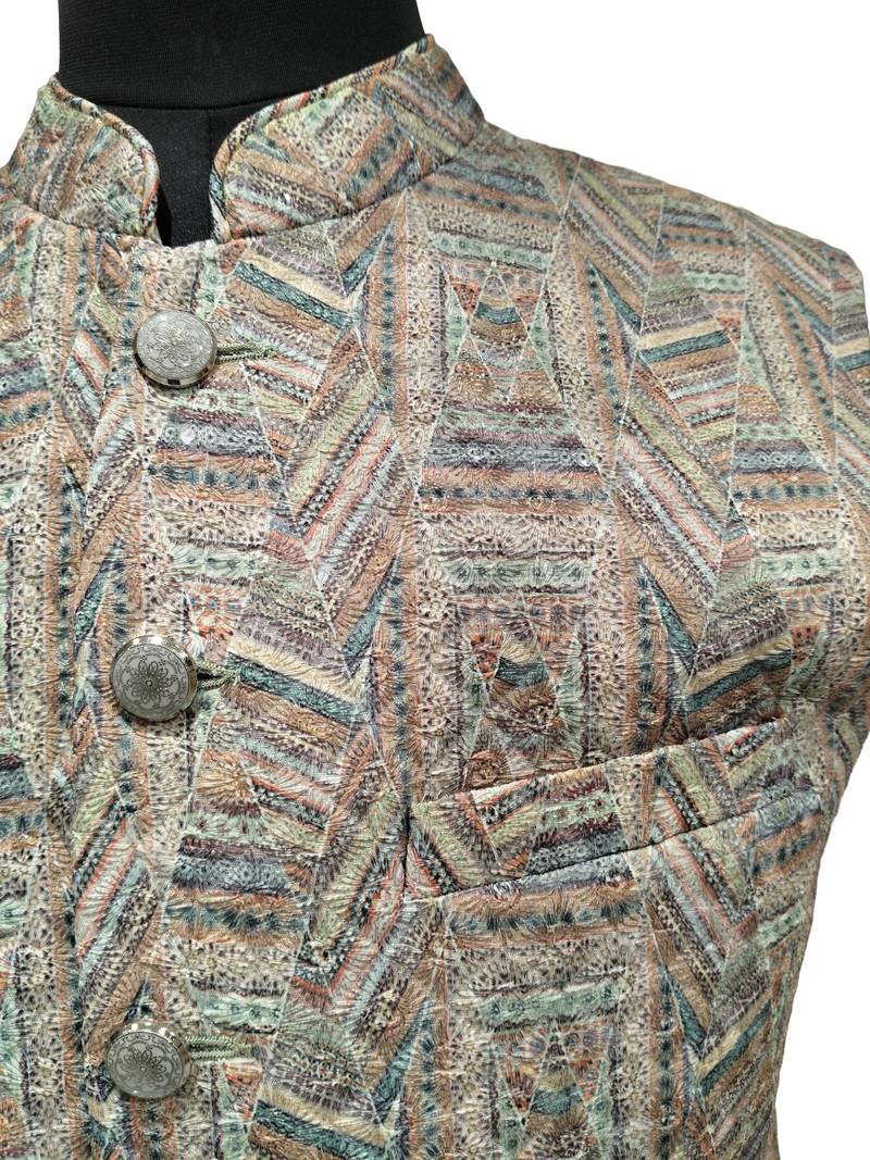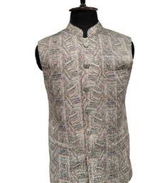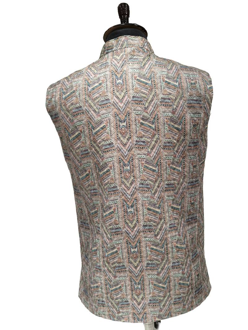 | Product Description | This Item Is A Traditional Men's Ethnic Nehru Jacket, Often Referred To As A "Bandhgala" Or "Modi Jacket." It Features A Structured, Sleeveless Design With A Mandarin Collar (Band Collar) And Button Down Front. The Fabric Has A Detailed Geometric And Textured Pattern In A Palette Of Earthy Pastels, Including Shades Of Beige, Mint Green, Terracotta, And Muted Blue. The Pattern Is Intricate, Giving The Jacket A Rich, Artisanal Handcrafted Look.