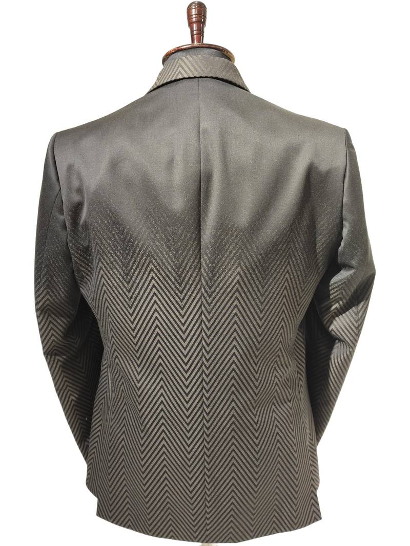 | Product Description | Elegant Charcoal Grey Blazer Featuring A Bold Chevron Weave Pattern That Adds Depth And Luxury To The Overall Look. Crafted In Premium Textured Suiting Fabric, Offering A Smooth Handfeel With Subtle Sheen For Evening And Occasion Wear. Tailored With A Sleek Notch Lapel, Structured Shoulders, And A Sharp Slim Fit Silhouette For A Refined, Modern Appearance. Detailed With Matching Chevron Patterned Flap Pockets, Two Button Front Closure, And Neatly Finished Sleeve Buttons For A Polished Finish. Paired Best With A Solid Dark Shirt To Highlight The Intricate Woven Design, Making It Ideal For Receptions, Parties, And Premium Events. |