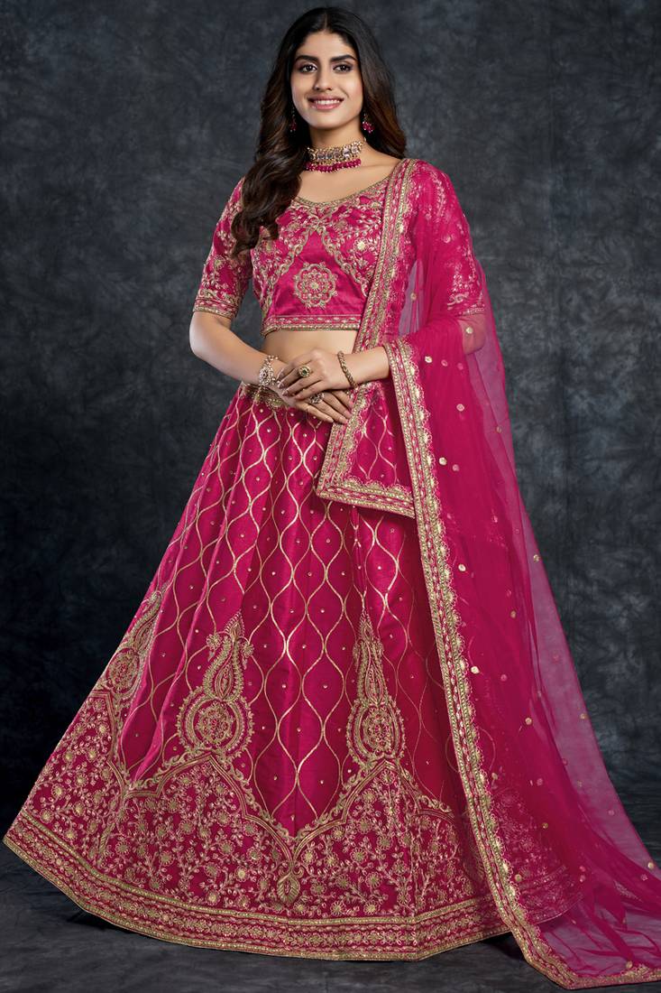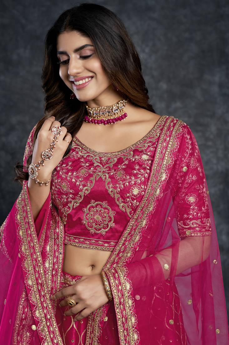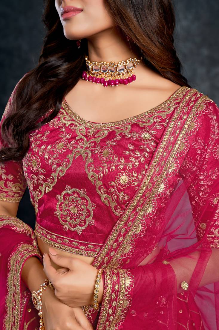 A Pink Color Diamond, Zari, Thread, And Sequins Embroidery Work Bridal Lehenga Choli With Dupatta In Art Silk Is A Stunning Traditional Indian Outfit For Brides. The Lehenga Choli Is A Three Piece Attire, Which Includes A Long Skirt (Lehenga), A Blouse (Choli), And A Dupatta (Scarf).