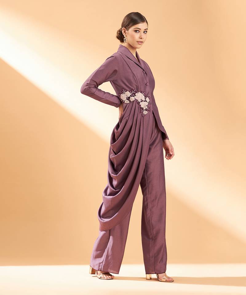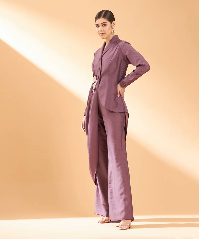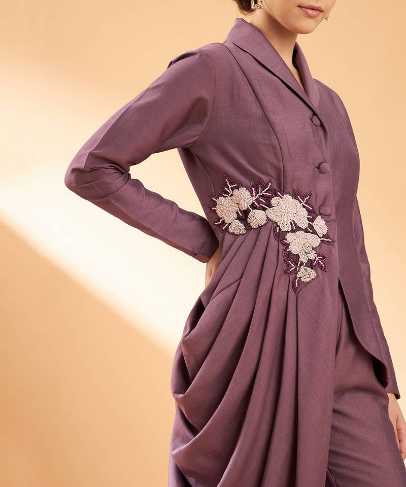 The Co Cord Set Includes An Asymmetrical Blazer Featuring Cowls And Embroidery At Neckline, Paired With Pants.