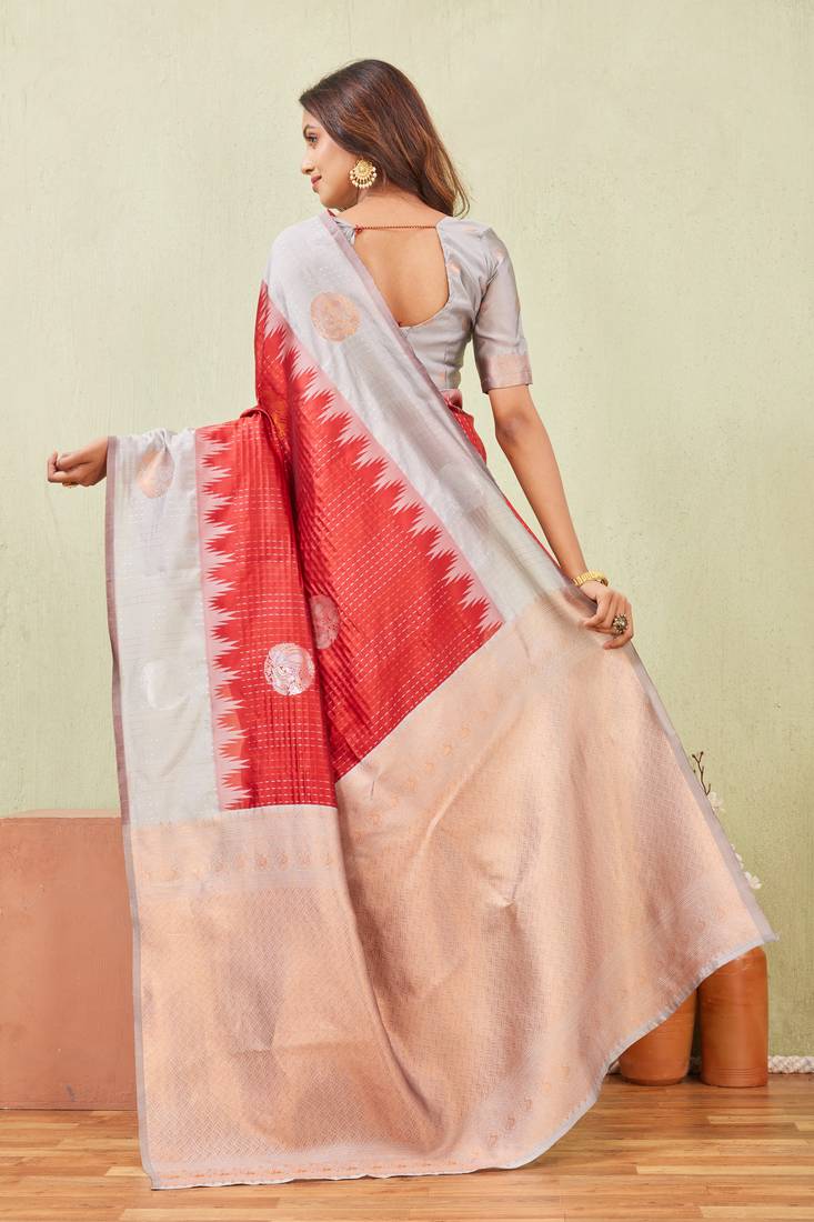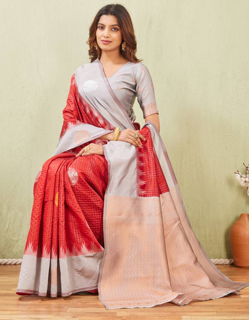 Grey red art silk jacuard work designer party wear saree with unstitched blouse piece