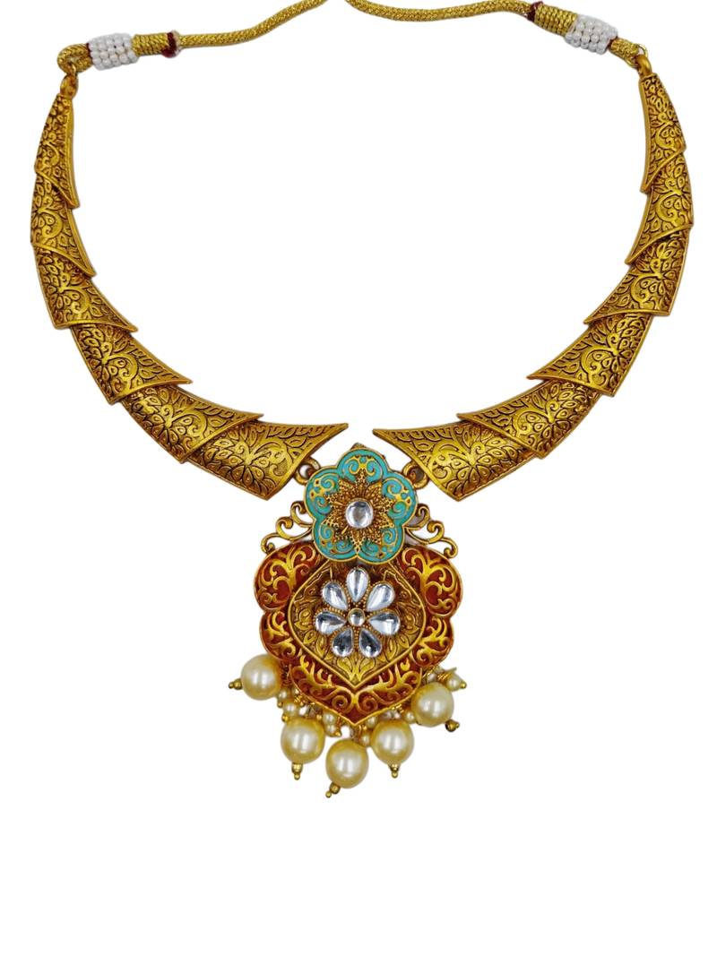 Product Description | Elegant Antique Gold Tone Necklace Set With Intricate Detailing, Kundan Stones, And Pearl Drops. Perfect For Weddings, Festivals, And Traditional Occasions. |