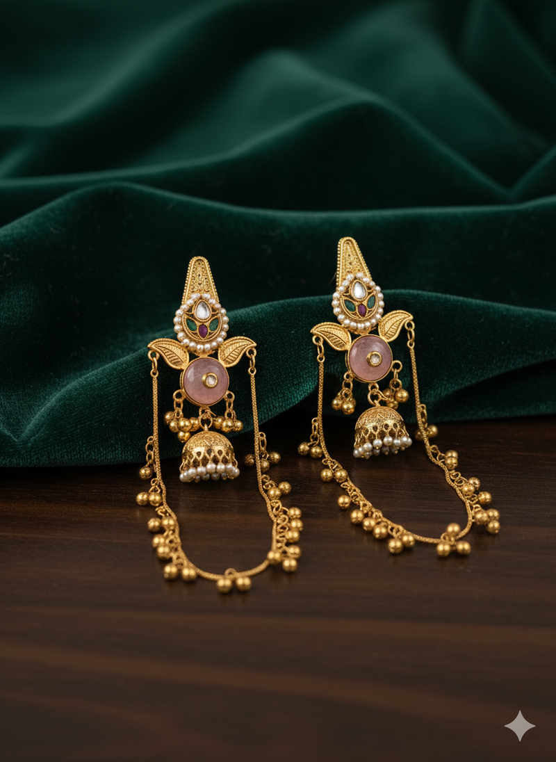 Gold plated kashmiri kundan pearl jhumka earrings with pink stone & chain