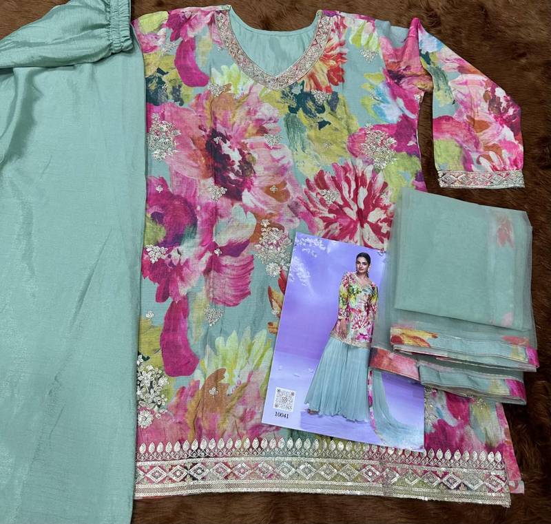 | Product Description | Chinon Silk Embroidered Wedding Sharara Suits Min Size 38 Max Size 42 |
