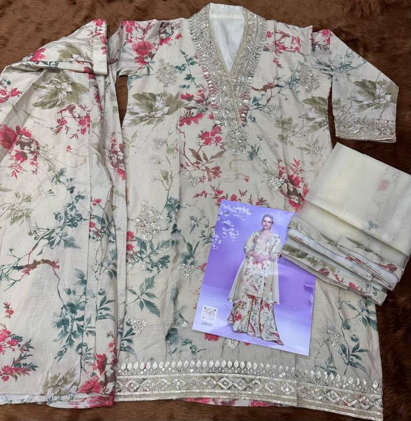 | Product Description | Chinon Silk Embroidered Wedding Sharara Suits Min Size 38 Max Size 42 |