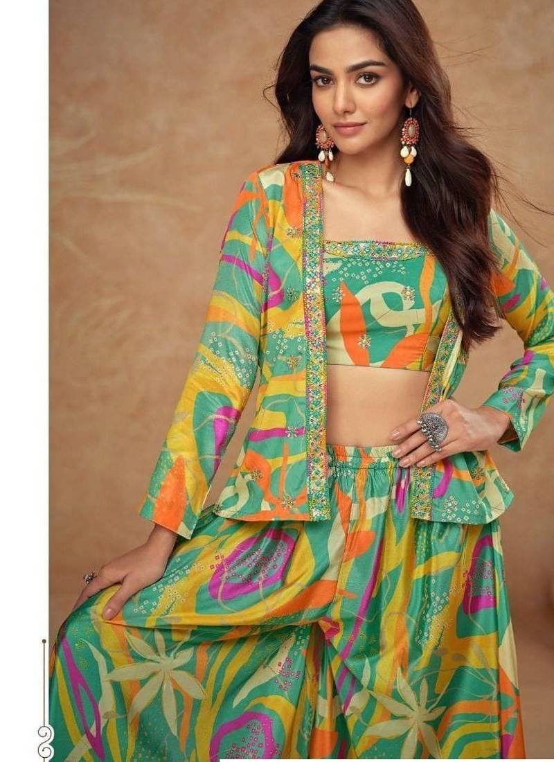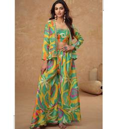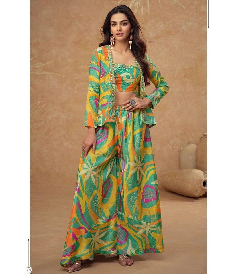 Parrot green digital print indowestern wedding collection free size upto 42 stitched