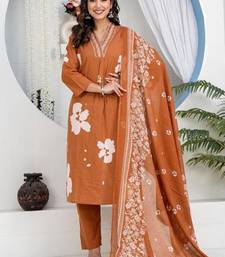 Brown floral embroidered round neck pure cotton kurta with trouser & dupatta