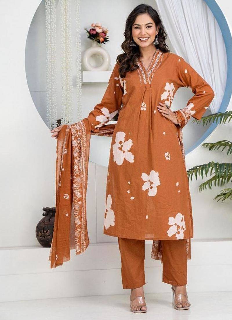 | Product Name | Brown Floral Embroidered Round Neck Pure Cotton Kurta With Trouser & Dupatta | |