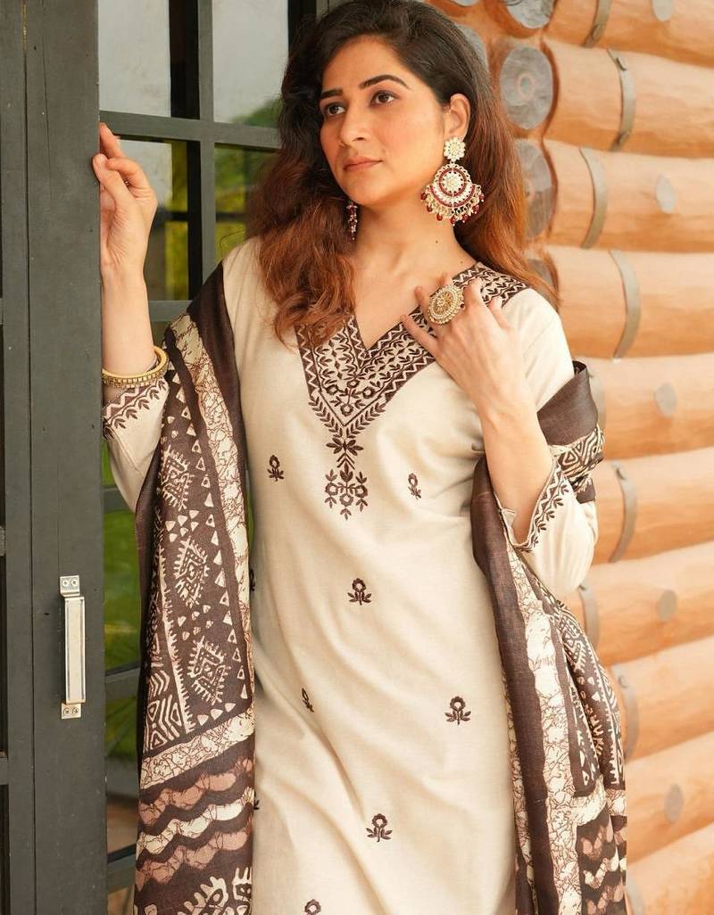 White floral embroidered off v-neck pure cotton kurta with trouser &dupatta