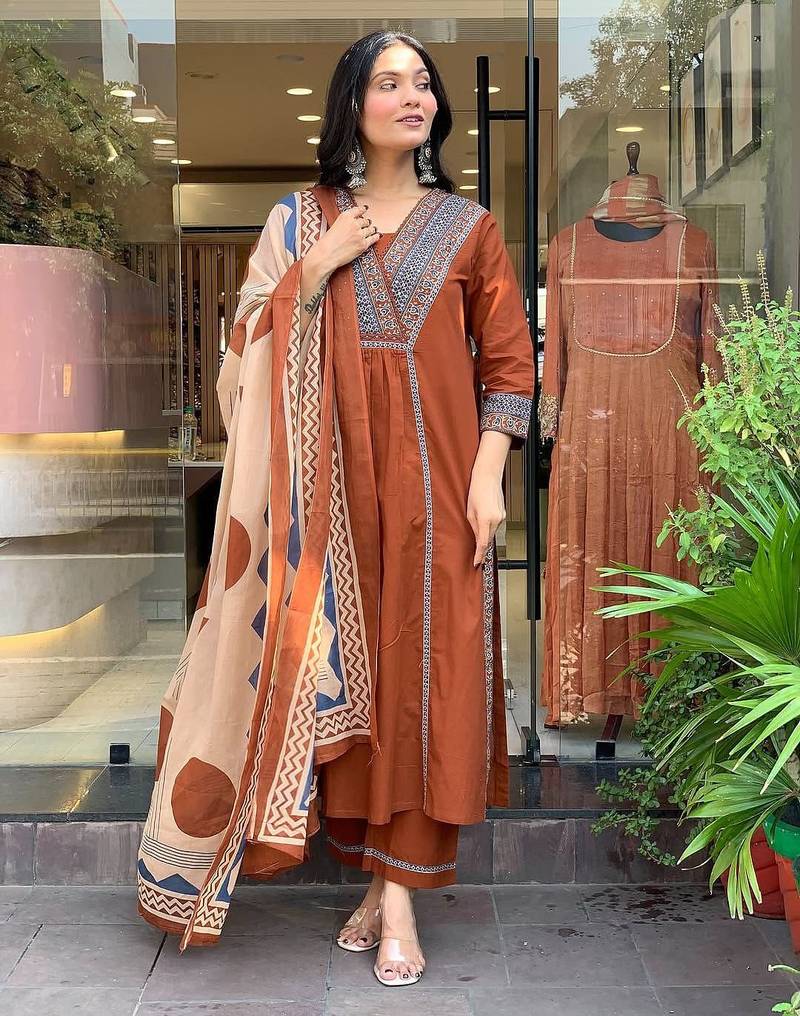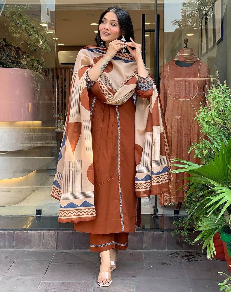 | Product Name | Aaysa Floral Printed Brown V Neck Pure Cotton Kurta With Trouser & Dupatta | |