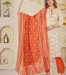 Orange floral printed round neck pure cotton kurta with trouser & dupatta