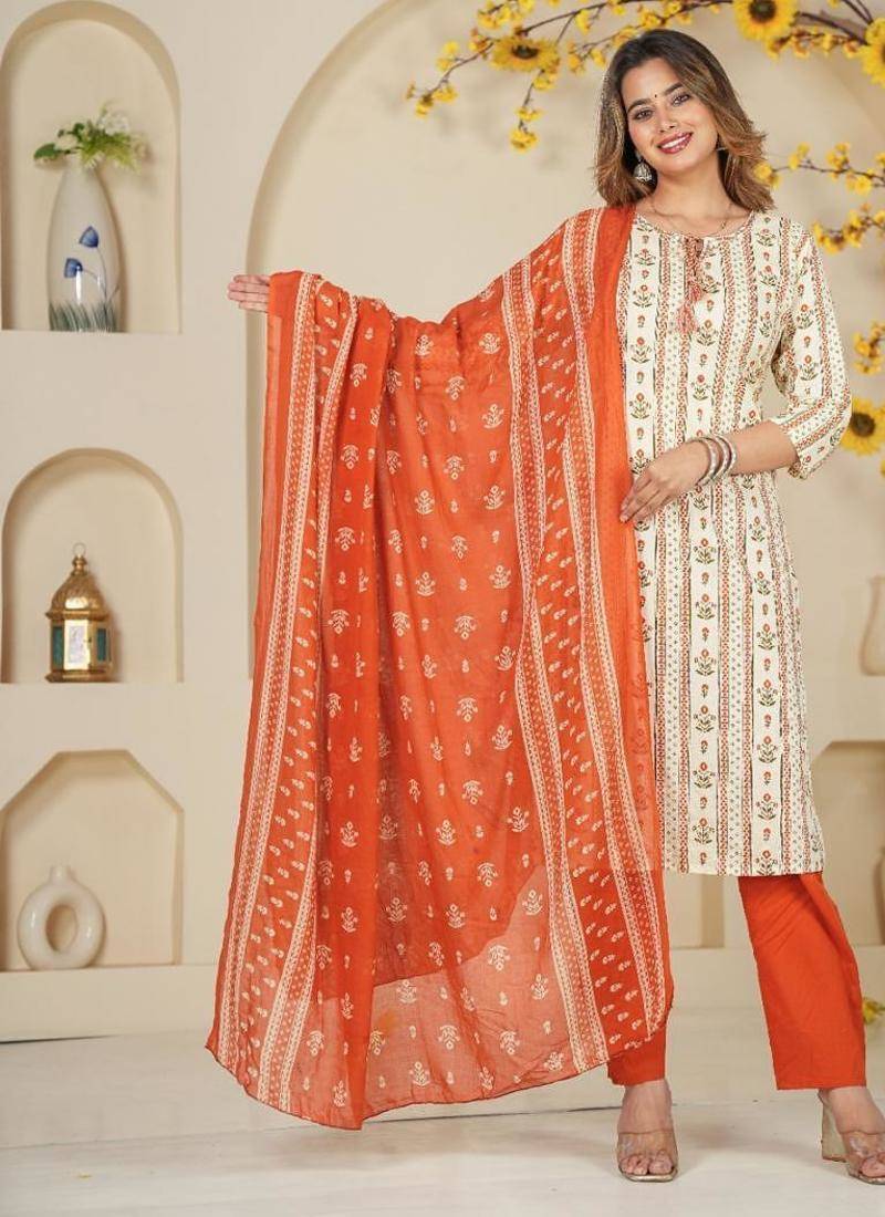 | Product Name | Orange Floral Printed Round Neck Pure Cotton Kurta With Trouser & Dupatta | |