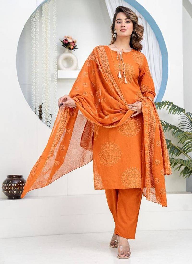 | Product Name | Orange Floral Printed Round Neck Pure Cotton Kurta With Trouser & Dupatta | |