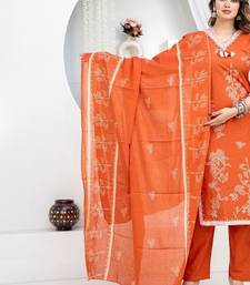 Orange floral printed round neck pure cotton kurta with trouser & dupatta