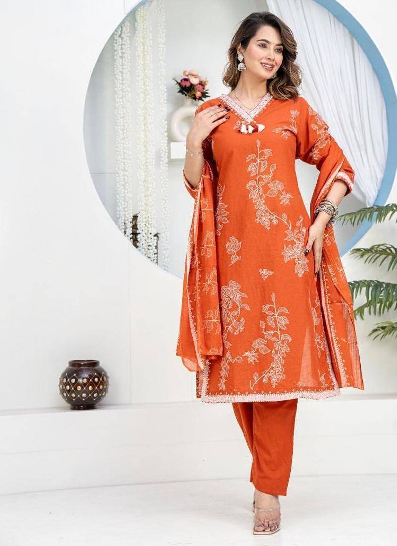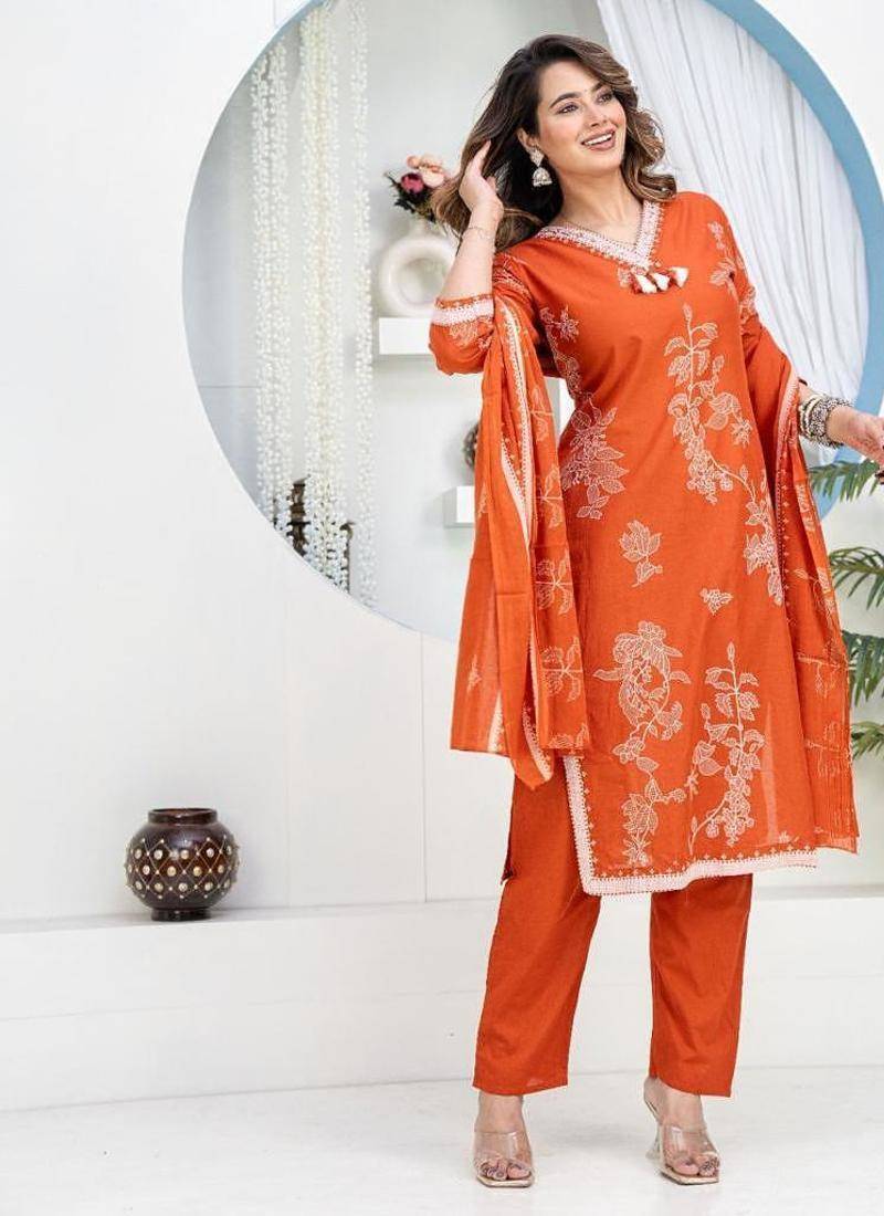 | Product Name | Orange Floral Printed Round Neck Pure Cotton Kurta With Trouser & Dupatta | |