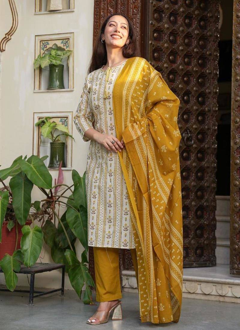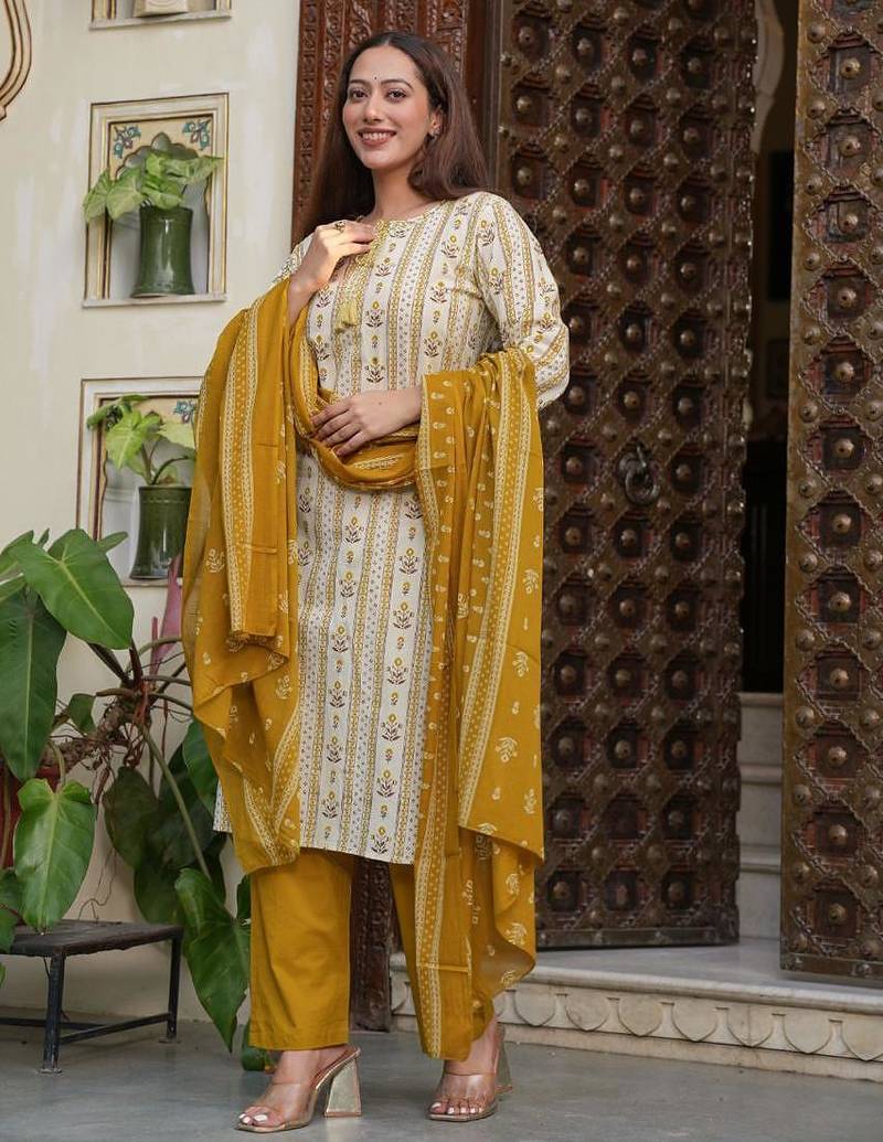 | Product Name | Yellow Floral Printed Round Neck Pure Cotton Kurta With Trouser & Dupatta | |