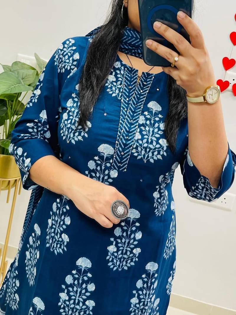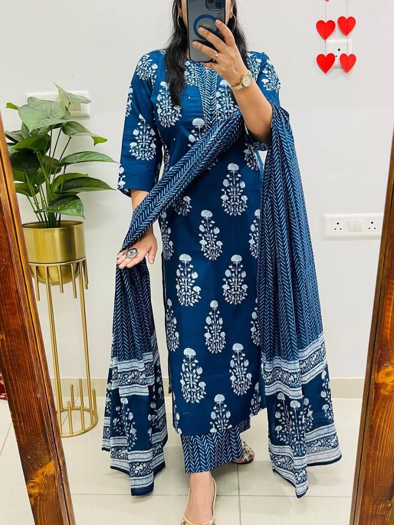Product Name | Women Pure Cotton Printed Blue Kurta With Pant And Dupatta | |