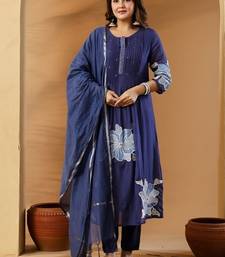 Blue embroidered round neck pure cotton kurta trouser dupatta set