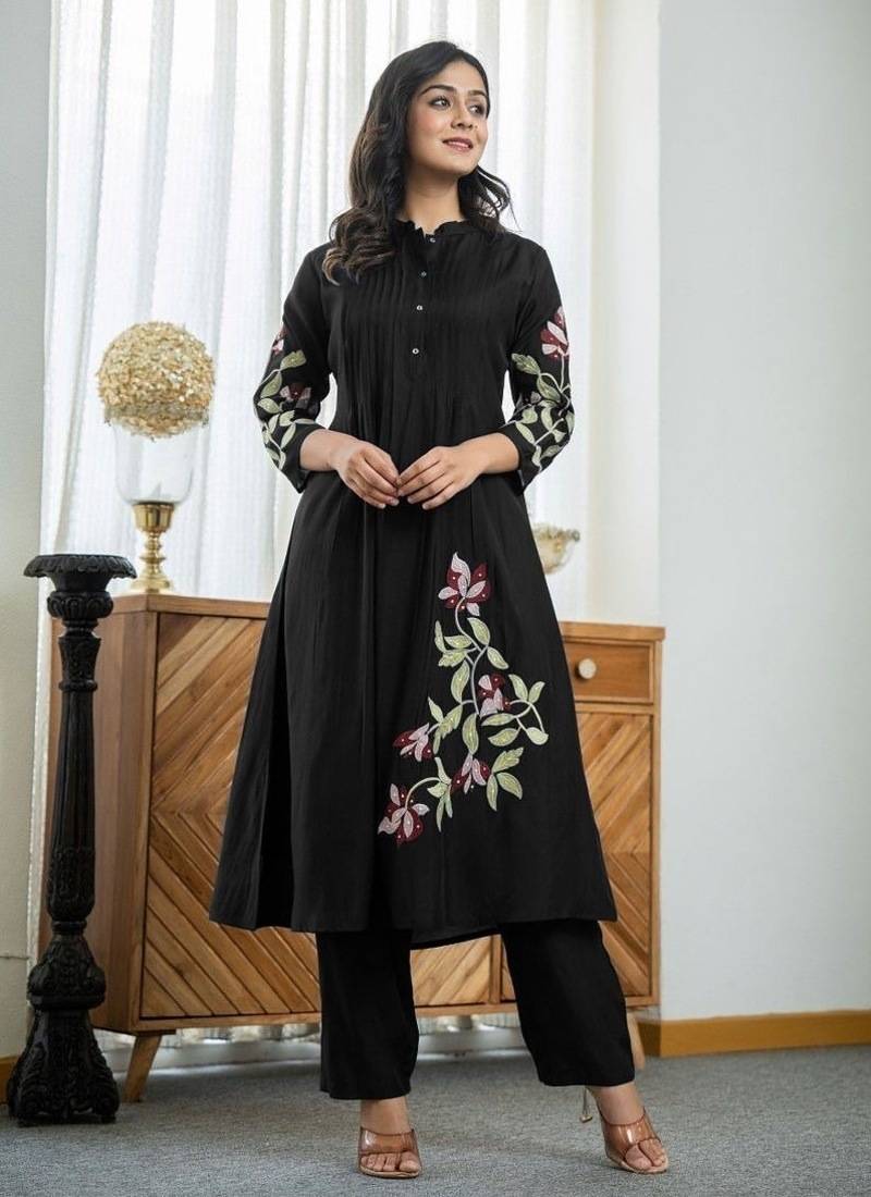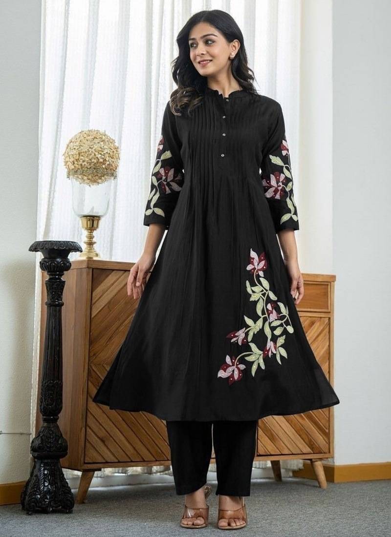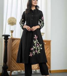 Night Bloom: Floral Embroidered Black Cotton Kurta Set Exude Subtle Sophistication With This Elegant Floral Embroidered Black Pure Cotton Kurta And Trouser Set. Merging The Classic Appeal Of Black With The Comfort Of Pure Cotton And A Modern Neckline, This Set Is A Versatile Wardrobe Essential.Key Features & Design:Superior Pure Cotton: Crafted From 100% Breathable Pure Cotton, The Fabric Ensures All Day Comfort, Making It Perfect For Both Structured Office Wear And Relaxed Social Gatherings.Modern V Neck: The Stylish V Neckline Elongates The Neck And Offers A Contemporary, Flattering Silhouette.Timeless Black Hue: The Deep Black Color Provides A Slimming, Chic Base, Making It Easy To Pair With Any Accessory And Suitable For Almost Any Occasion.Artisan Floral Embroidery: Delicate Floral Embroidery Subtly Adorns The Kurta, Typically Highlighting The V Neck And Perhaps The Sleeve Cuffs, Adding Texture And A Soft Feminine Contrast To The Dark Fabric.Coordinated Trousers: The Set Is Complete With A Perfectly Matched Pair Of Black Cotton Trousers (Straight Cut Or Semi Slim Fit) For A Streamlined, Ready To Wear Ensemble.1 Size Range: Available In Comfortable Sizes From Medium (M) To Double Extra Large (Xxl).2 Detail Specification Material Pure Cotton Color Black Neckline V Neck Design Floral Embroidery Ideal For Evening Wear, Office, Casual Dinners