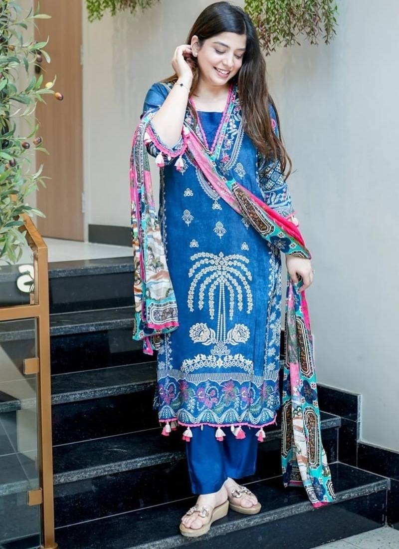 | Product Name | Floral Embroidered Blue Round Neck Muslin Kurta Set With Trouser & Dupatta | |