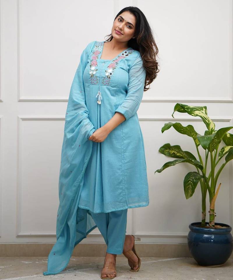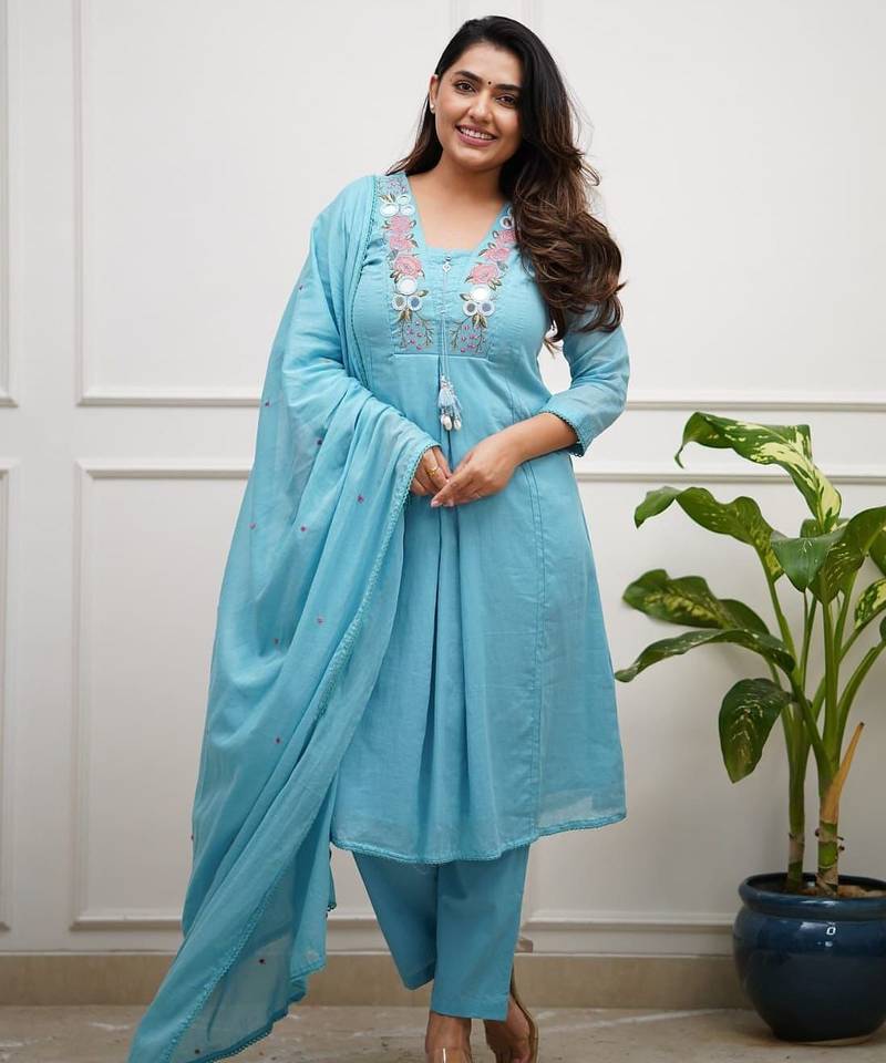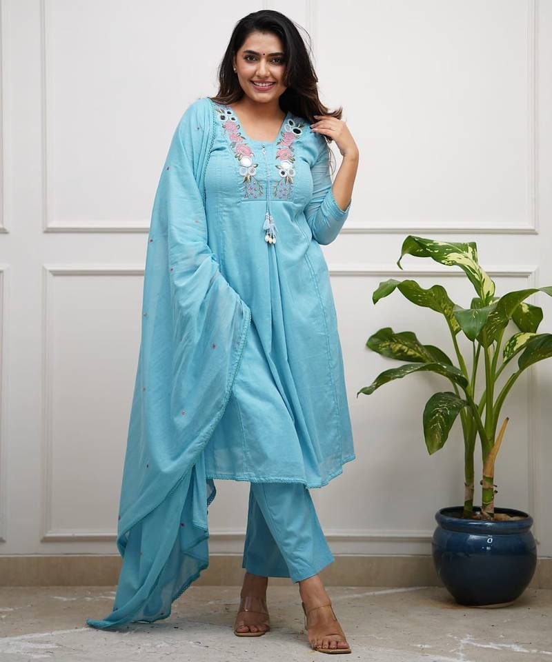 | Product Name | Floral Embroidered Blue V Neck Cotton Kurta Set With Trouser & Dupatta | |