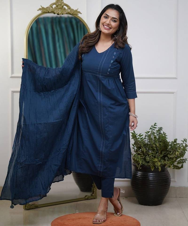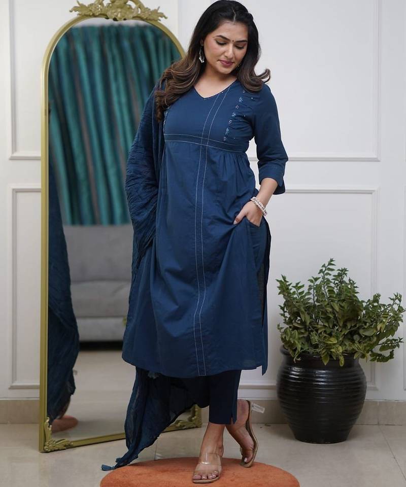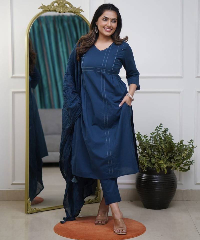 | Product Name | Floral Embroidered Blue V Neck Cotton Kurta Set With Trouser & Dupatta | |