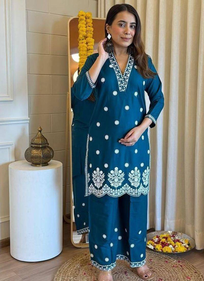 | Product Name | Floral Embroidered Blue V Neck Pure Cotton Kurta Set With Trouser | |