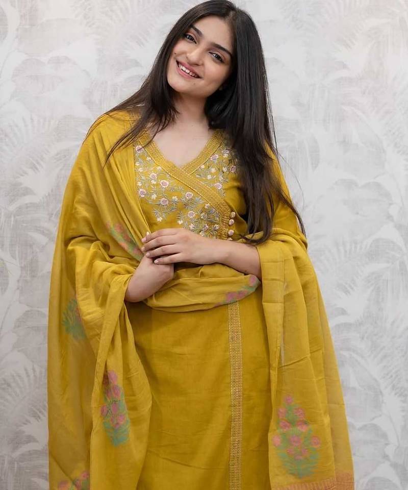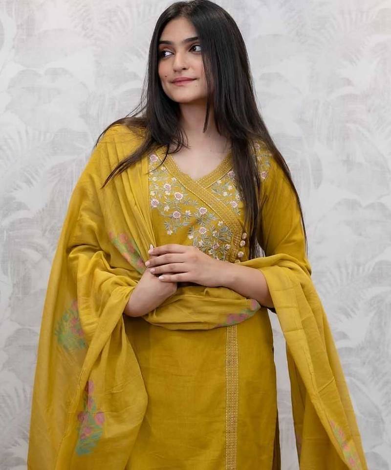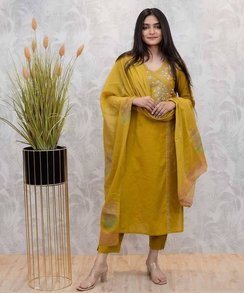 | Product Name | Floral Embroidered Dark Yellow V Neck Cotton Floral Kurta With Trousers & Dupatta Set | |